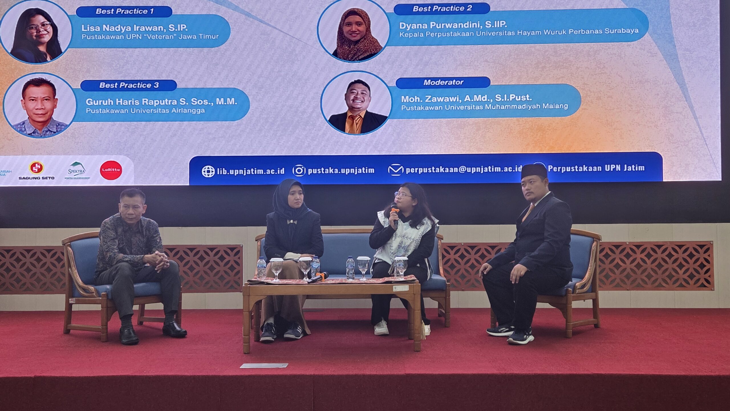 Selain itu, sesi Best Practices turut menjadi bagian penting dalam kegiatan ini dengan mengangkat tema “Librarians Driving Research Excellence and Institutional Transformation: From Practice to Impact.” Sesi ini dimoderatori oleh Moh. Zawawi, A.Md., S.I.Pust., dan menghadirkan para praktisi perpustakaan, yaitu Dyana Purwandini, S.IIP., Lisa Nadya Irawan, S.IP., serta Guruh Haris Raputra, S.Sos., M.M., yang berbagi pengalaman dan praktik terbaik dalam mendukung transformasi institusi melalui layanan perpustakaan.
